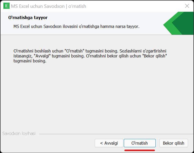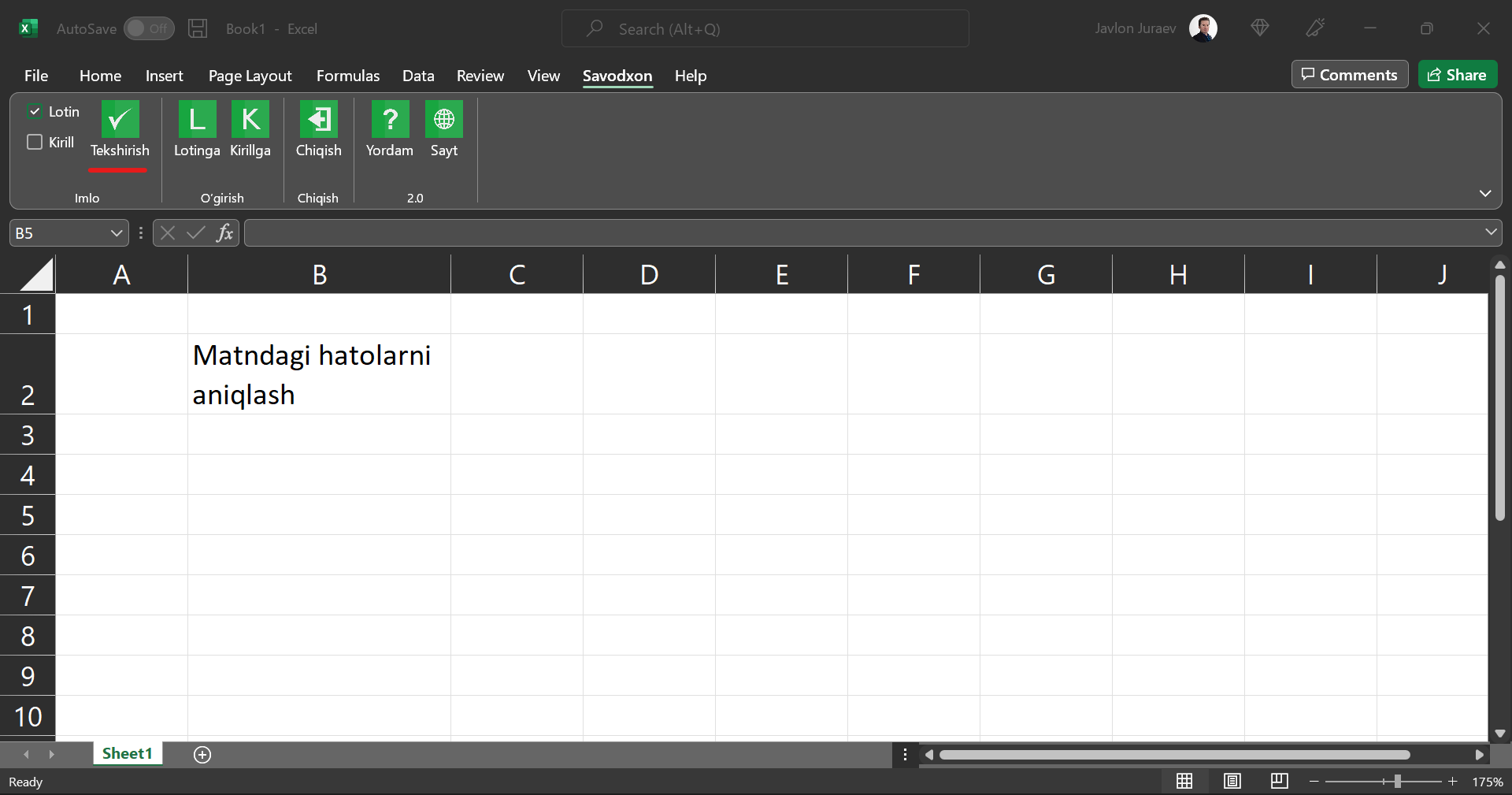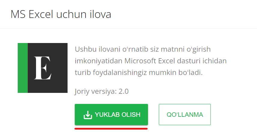 Ushbu ilova yordamida siz Savodxon xizmatlaridan bevosita Microsoft Excel dasturi ichida turib foydalana olasiz. Ilovaning eng soʻnggi versiyasini quyidagi tugma orqali yuklab olishingiz mumkin: