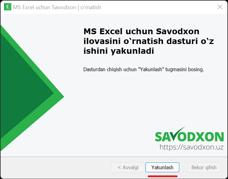 - Oʻrnatish jarayoni yakunlangach, dastur sizga soʻnggi sahifani koʻrsatadi. Bu ilova kompyuteringizga oʻrnatildi degani. Dasturni yopish uchun “Yakunlash” tugmasini bosing.