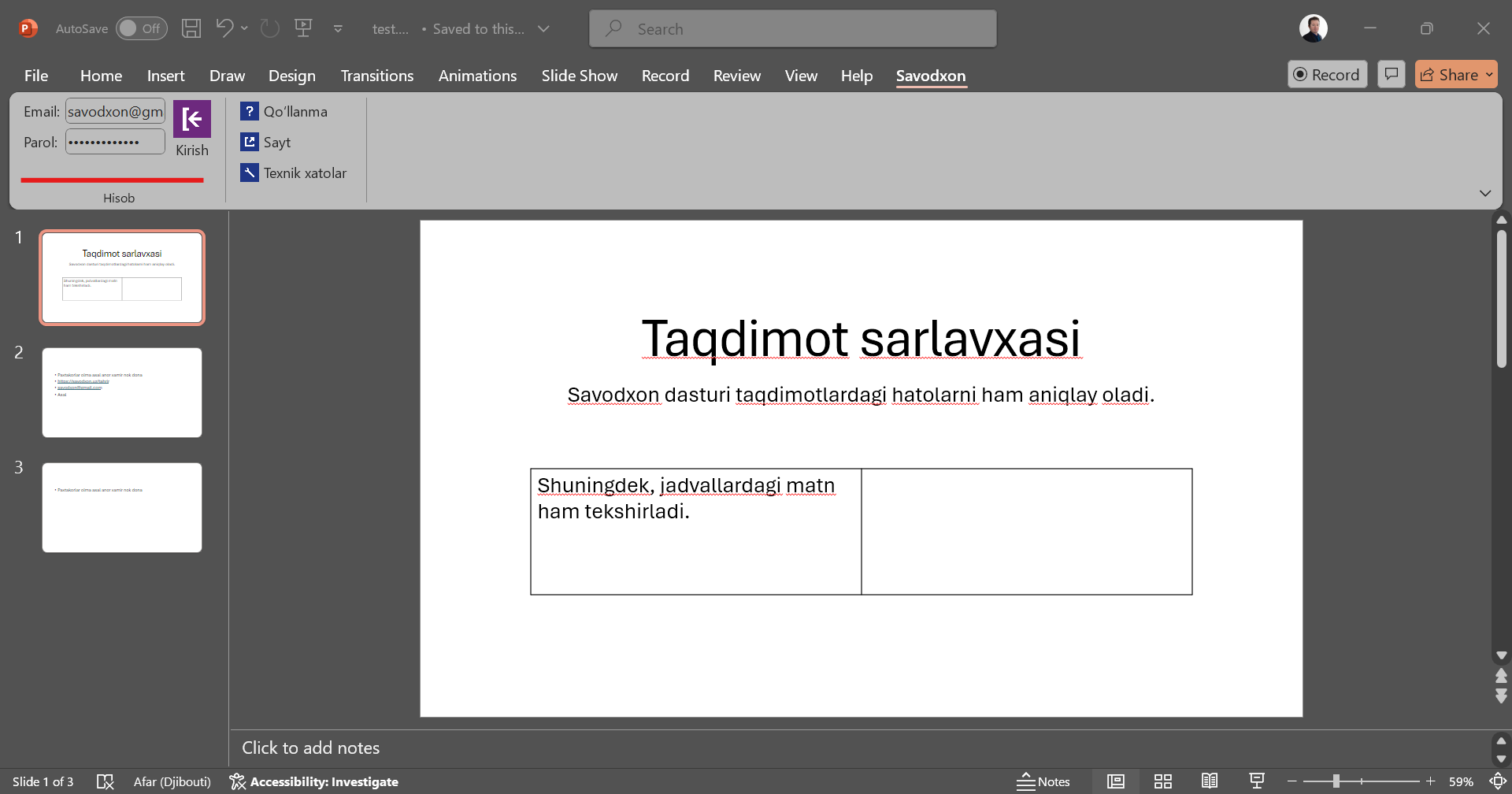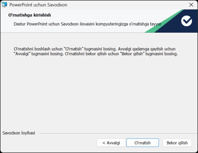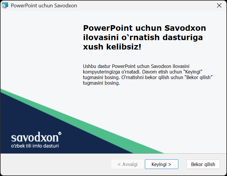 Ushbu ilova yordamida siz Savodxon xizmatlaridan bevosita Microsoft PowerPoint dasturi ichida turib foydalana olasiz. Ilovaning eng soʻnggi versiyasini quyidagi tugma orqali yuklab olishingiz mumkin: