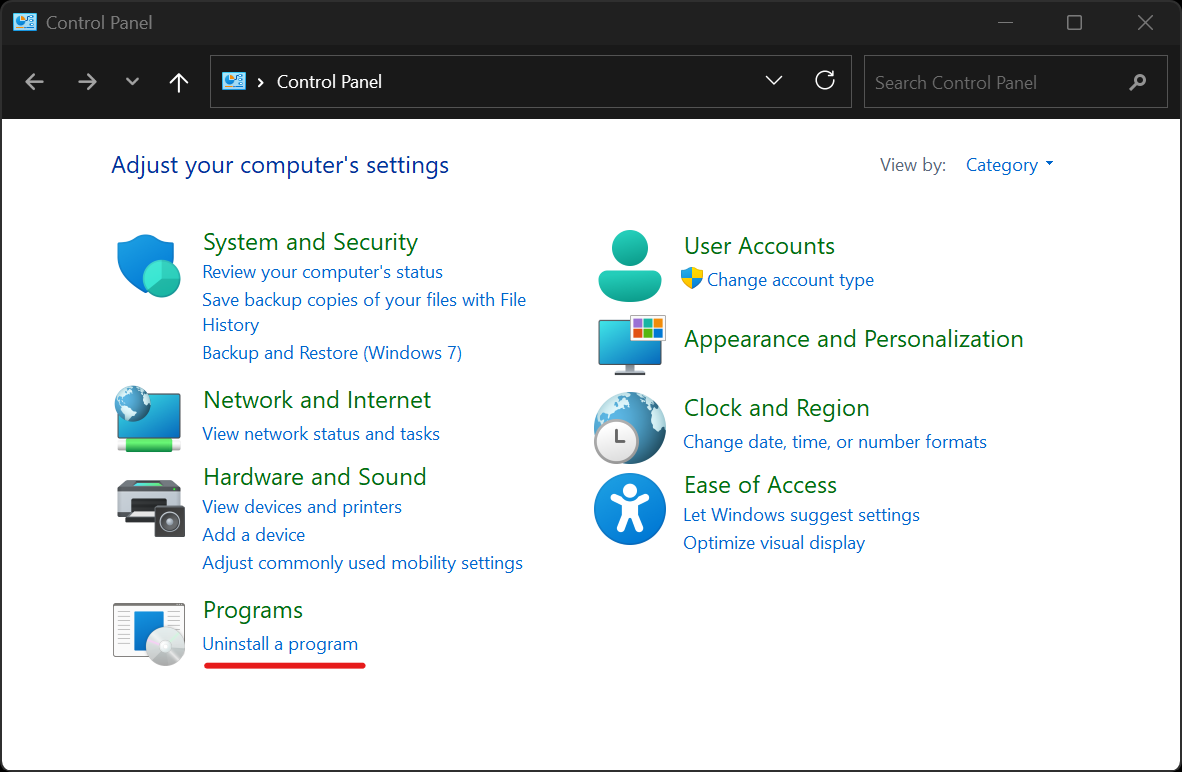 - Ilovani o'chirish uchun Windows operatsion tizimning "Панель управления" ("Control panel") boʻlimiga kiring va "Удаление программы" ("Uninstall a program") menyusini tanlang.