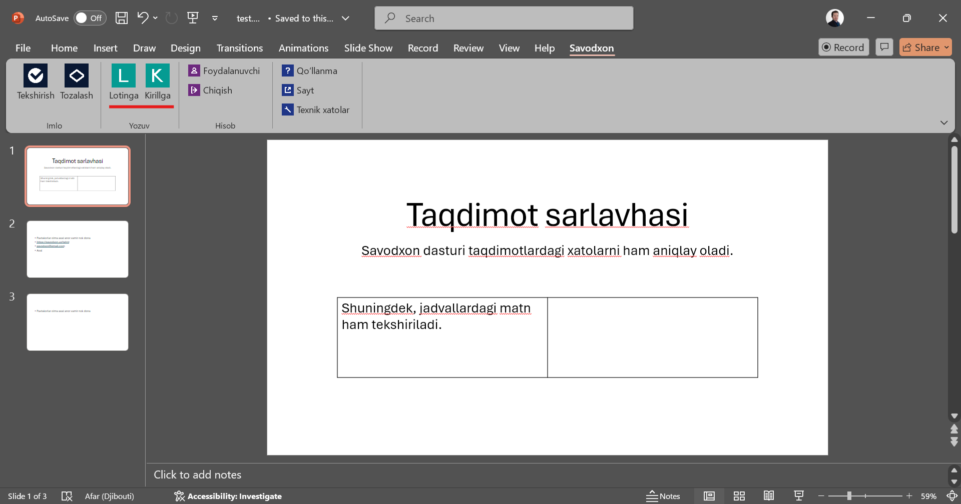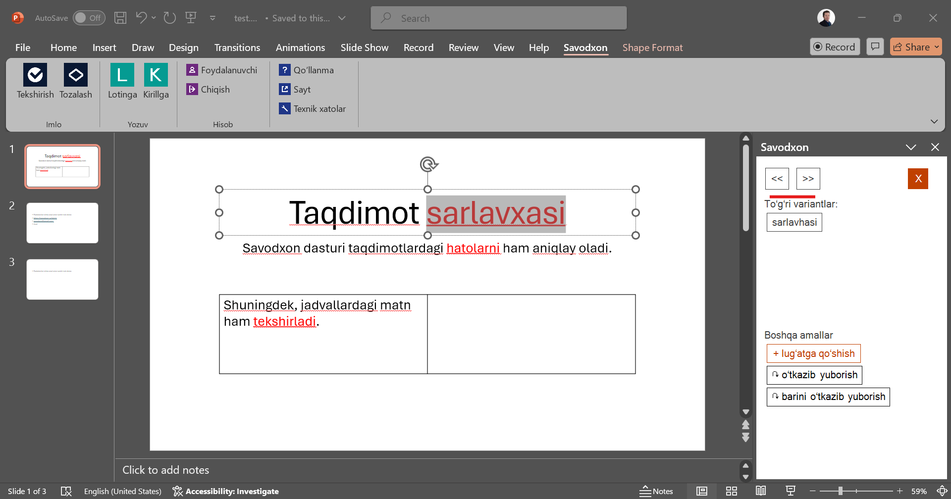 - Taqdimotdagi matnda mavjud imlo xatolarini aniqlash uchun “Tekshirish” tugmasini bosing. Agar taqdimotning faqat bir qismini tekshirmoqchi boʻlsangiz, kerakli slaydlarni belgilab, keyin “Tekshirish” tugmasini bosing.